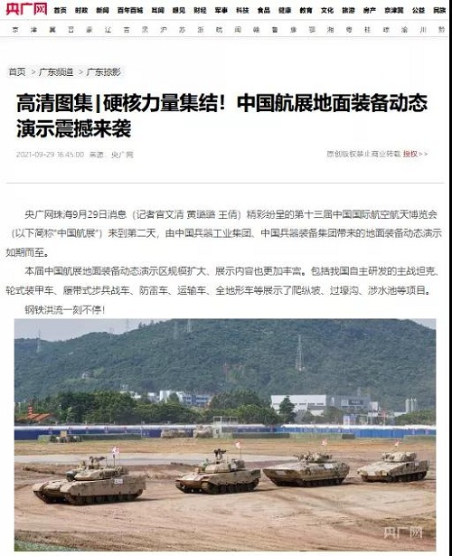 央視《新聞聯(lián)播》報(bào)道第十三屆中國(guó)航展,著重介紹了VT4主戰(zhàn)坦克,關(guān)注航展公眾日中國(guó)兵器館情況。9月28日下午央視《新聞直播間》航展特別節(jié)目《藍(lán)天盛會(huì)》邀請(qǐng)集團(tuán)公司訪談嘉賓做客直播間對(duì)中國(guó)兵器館兵器工業(yè)集團(tuán)展區(qū)等進(jìn)行1小時(shí)直播;9月28日下午、10月2日下午分別對(duì)地面裝備動(dòng)態(tài)表演進(jìn)行兩場(chǎng)直播。央視《朝聞天下》、《新聞直播間》、《共同關(guān)注》、《天下財(cái)經(jīng)》、《軍事報(bào)道》、《正午國(guó)防軍事》、《軍武零距離》等相繼推出集團(tuán)公司參展裝備的報(bào)道。